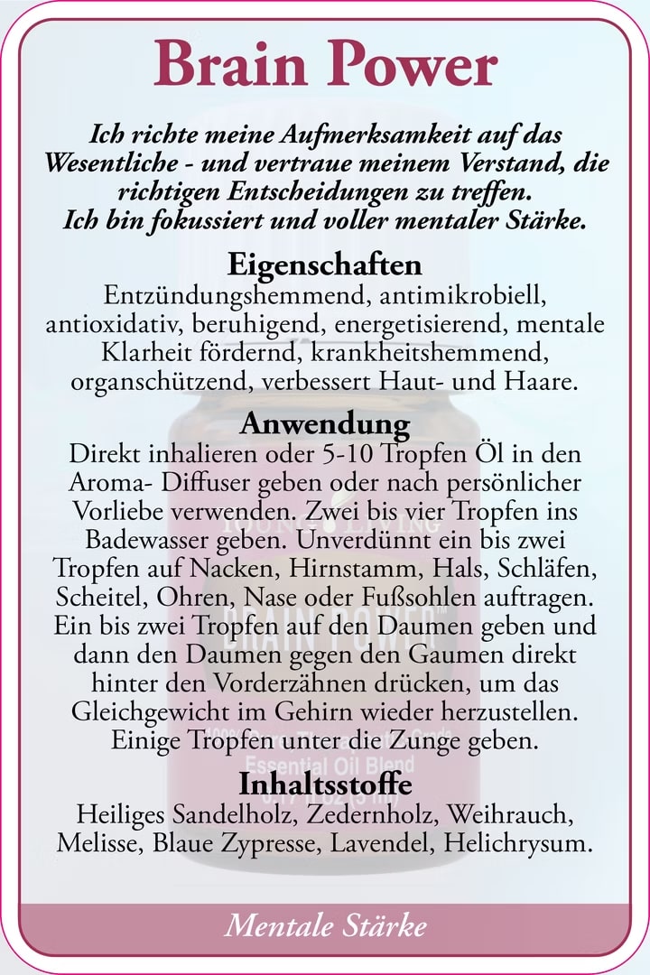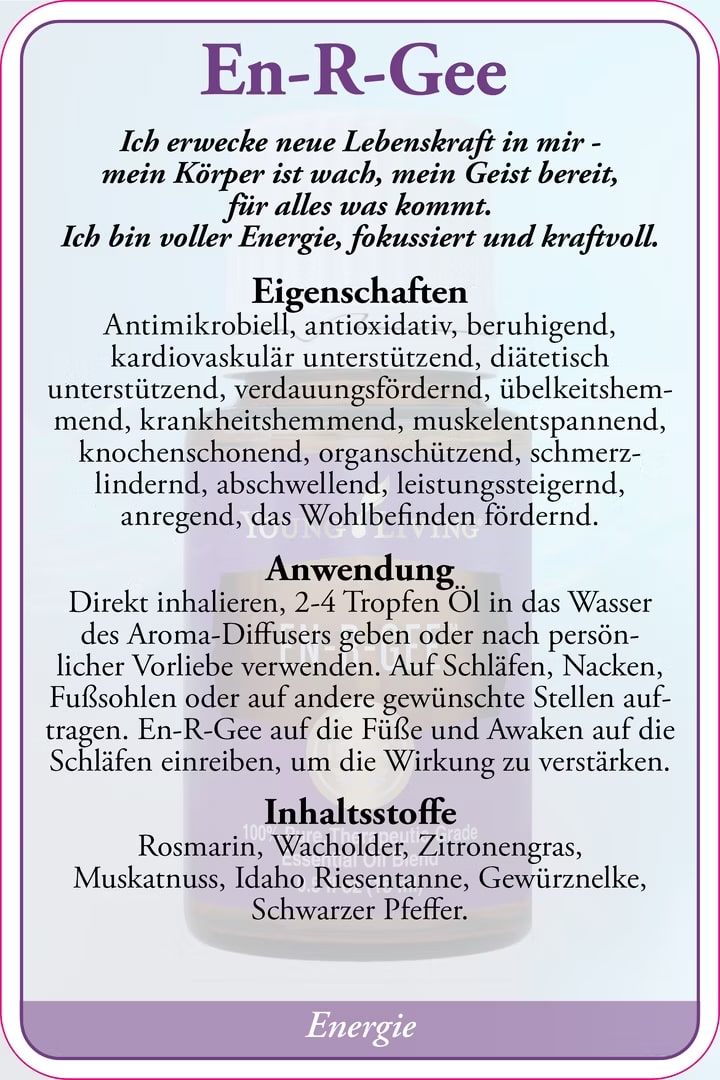 Alle hier angeführten Informationen sind Zitate von D. Gary Young (Author), Essential Science Publishing (Compiler), sämtliche Infos dienen ausschließlich zu Informationszwecken. Die Produkte von YoungLiving sind nicht zur Diagnose, Behandlung oder Vorbeugung einer Erkrankung vorgesehen (haben daher keinen Medizinischen Nutzen). Bei Erkrankung oder Verletzung immer Ihren Arzt konsultieren. Warn Hinweis: Öle nicht in die Augen, Ohren oder auf Schleimhäute geben (falls es doch passiert nicht mit Wasser sondern mit Speiseöl (zB. Olivenöl) reinigen. Vorsicht: Zitrusöl oder Öle die Zitrusöle enthalten sind sehr lichtempfindlich und sollte nicht auf Hautstellen aufgetragen werden, die innerhalb der nächsten 72 Stunden in direkten Kontakt mit Sonnen- oder UV-Licht gelangen.